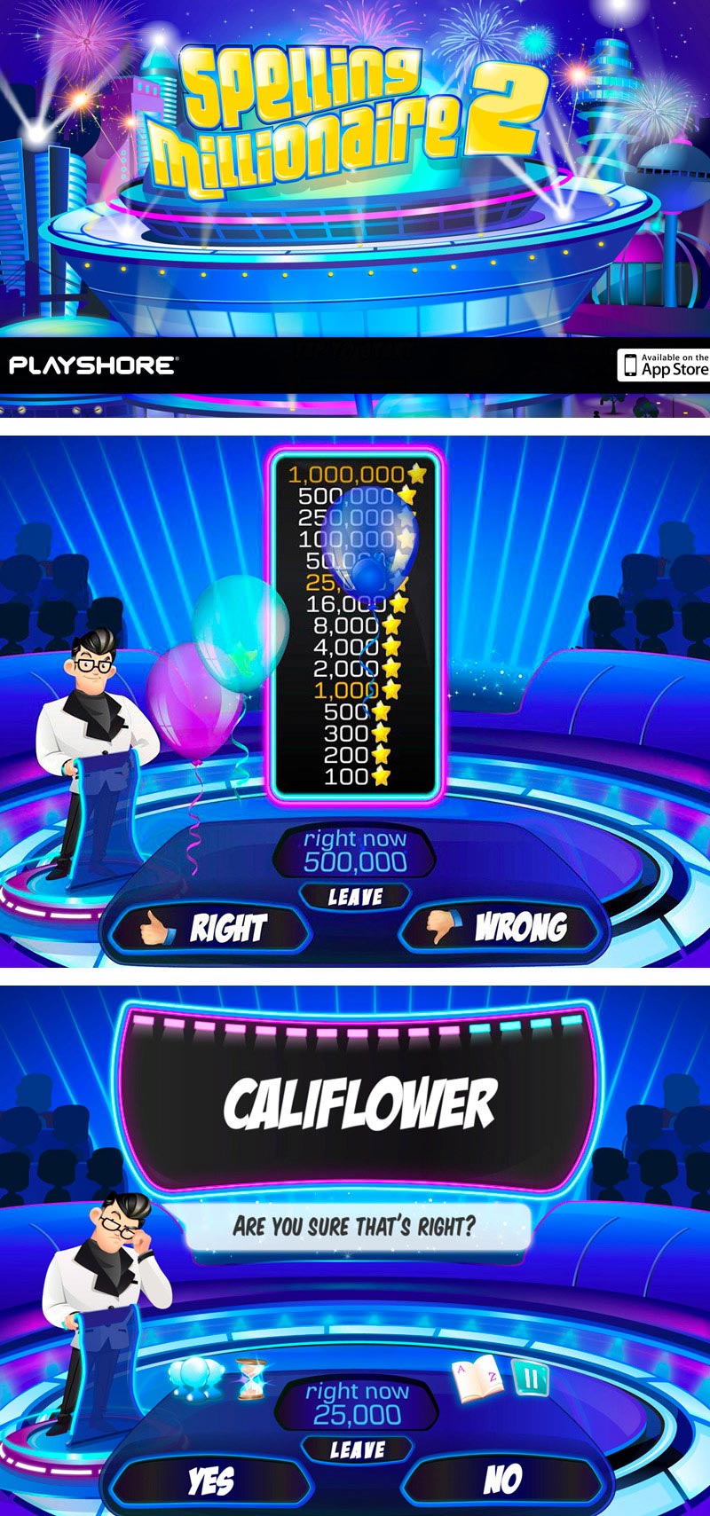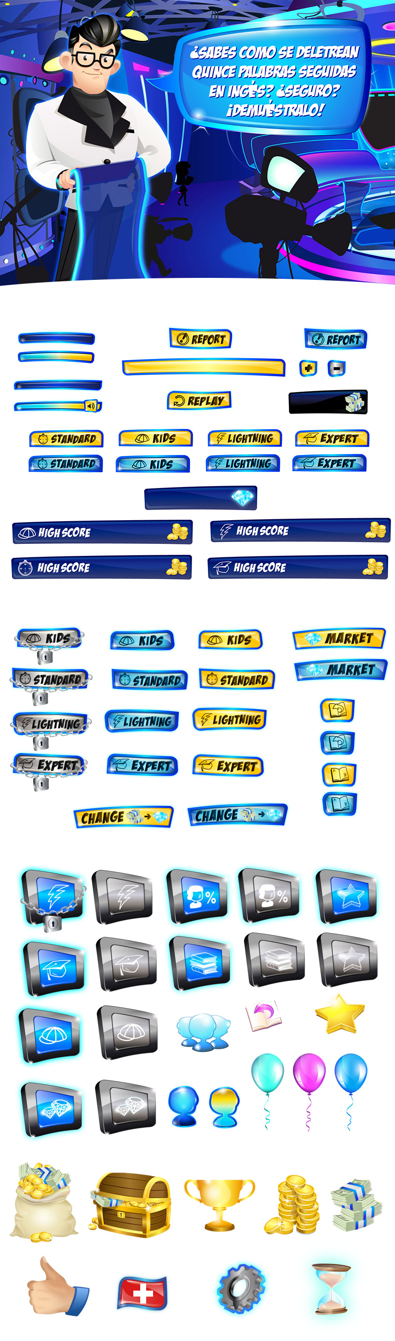 En este proyecto trabajé para Playshore, realicé varias ilustraciones para la aplicación Spelling millionaire 2. Querían un estilo cartoon y una gama de colores eléctricos típicos de un plató de televisión. Diseñé al presentador y al guardia de la caja fuerte a parte de todos los fondos, iconos y logotipo del juego.