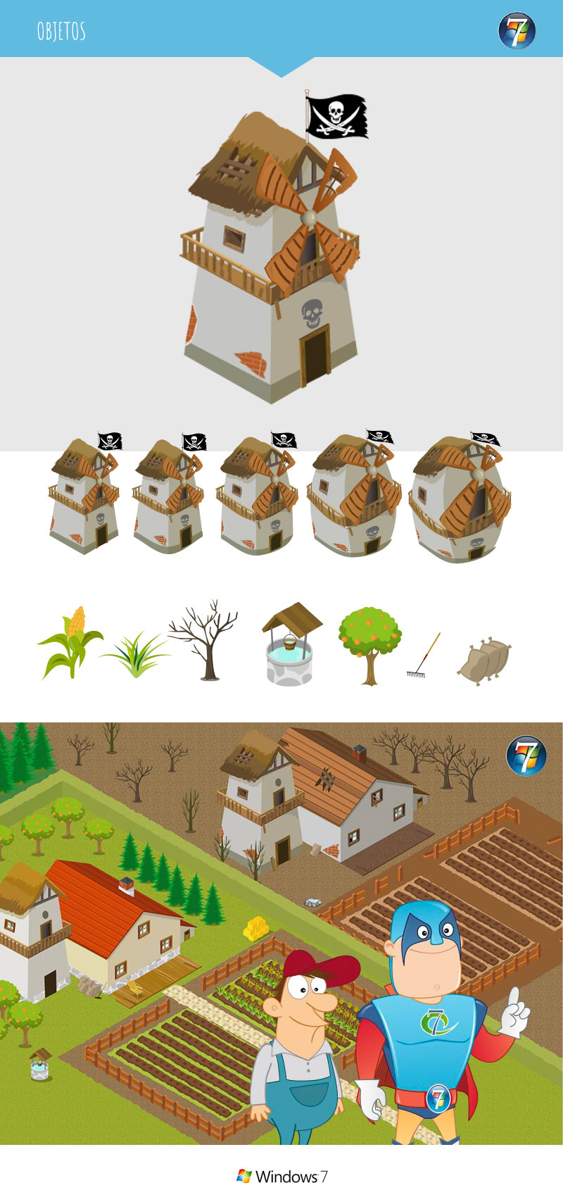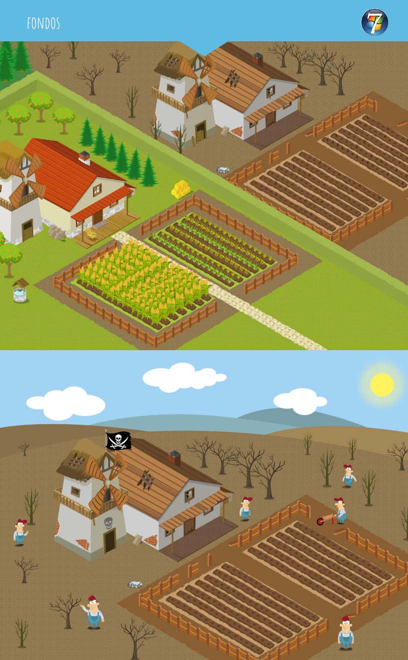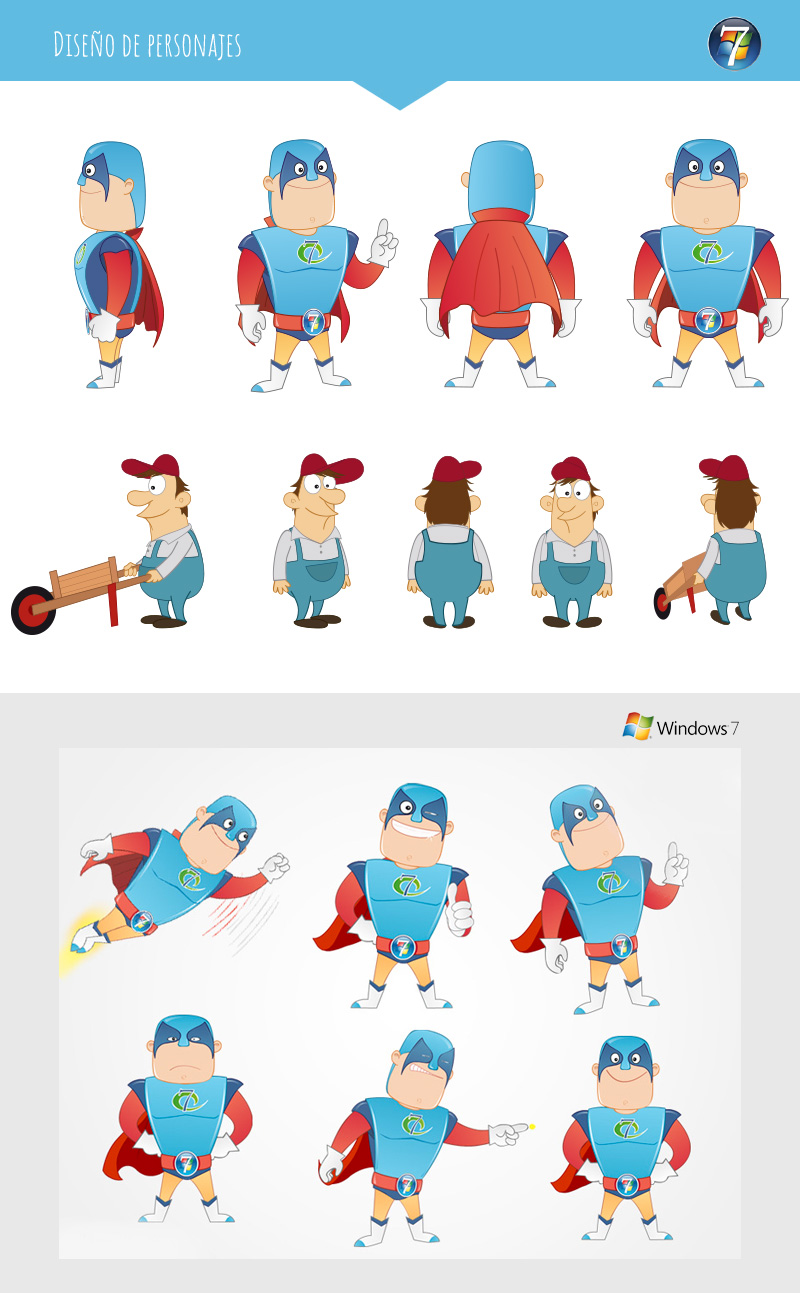 En este curso interactivo colaboré con Estudio Clandestino diseñando dos personajes: El granjero y el personaje de Windows7, además realicé los fondos con perspectiva isométrica y la animación de varias escenas para un posterior montaje.