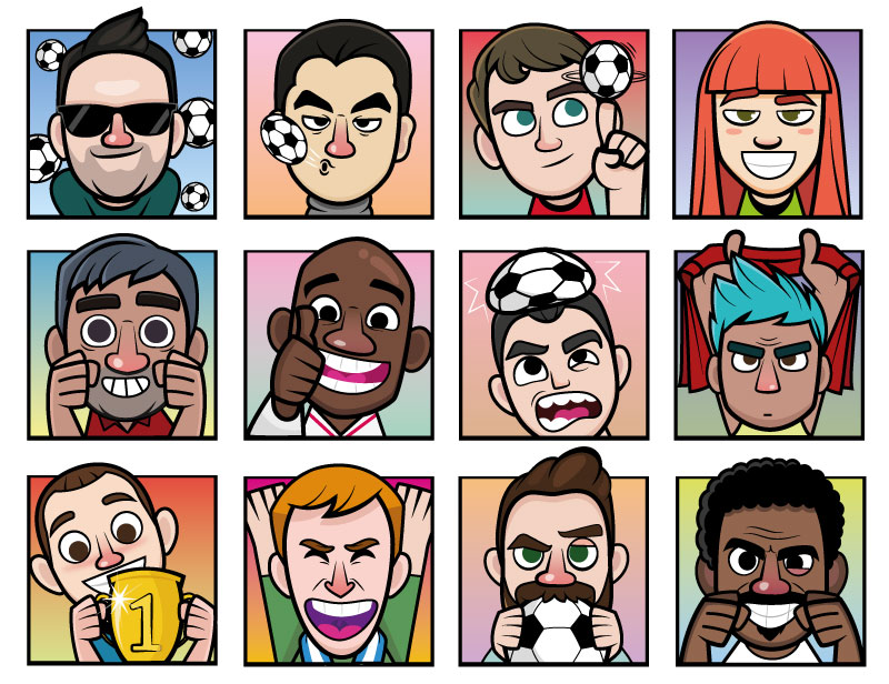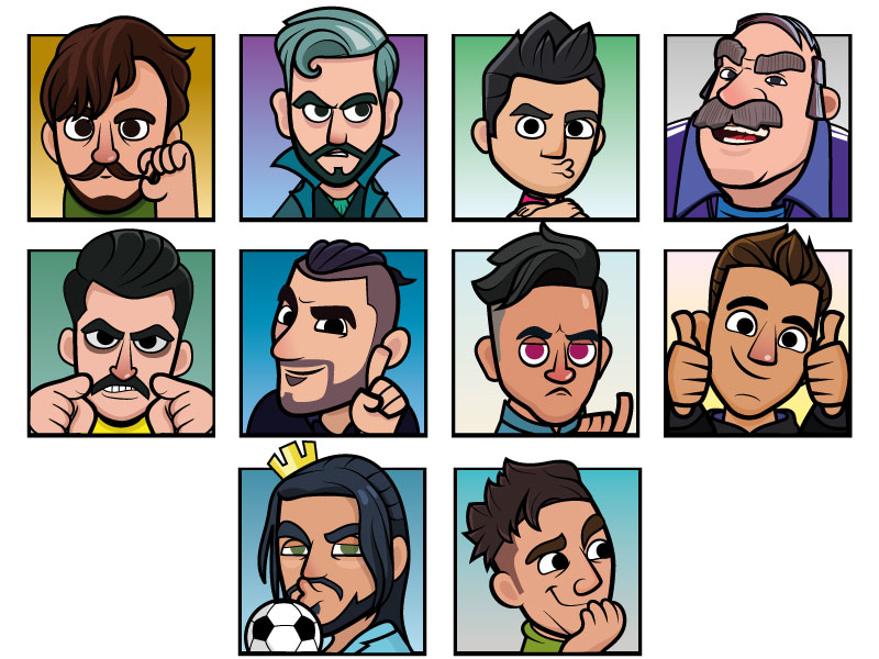 Diseño e ilustración de avatares personalizados con los rasgos de los trabajadores de la empresa y alguno de los jugadores de Soccer Royale.